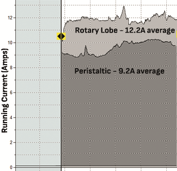 Average running current draw for the rotary lobe pump and the LSM peristaltic pump was 12.2A and 9.2A, respectively.