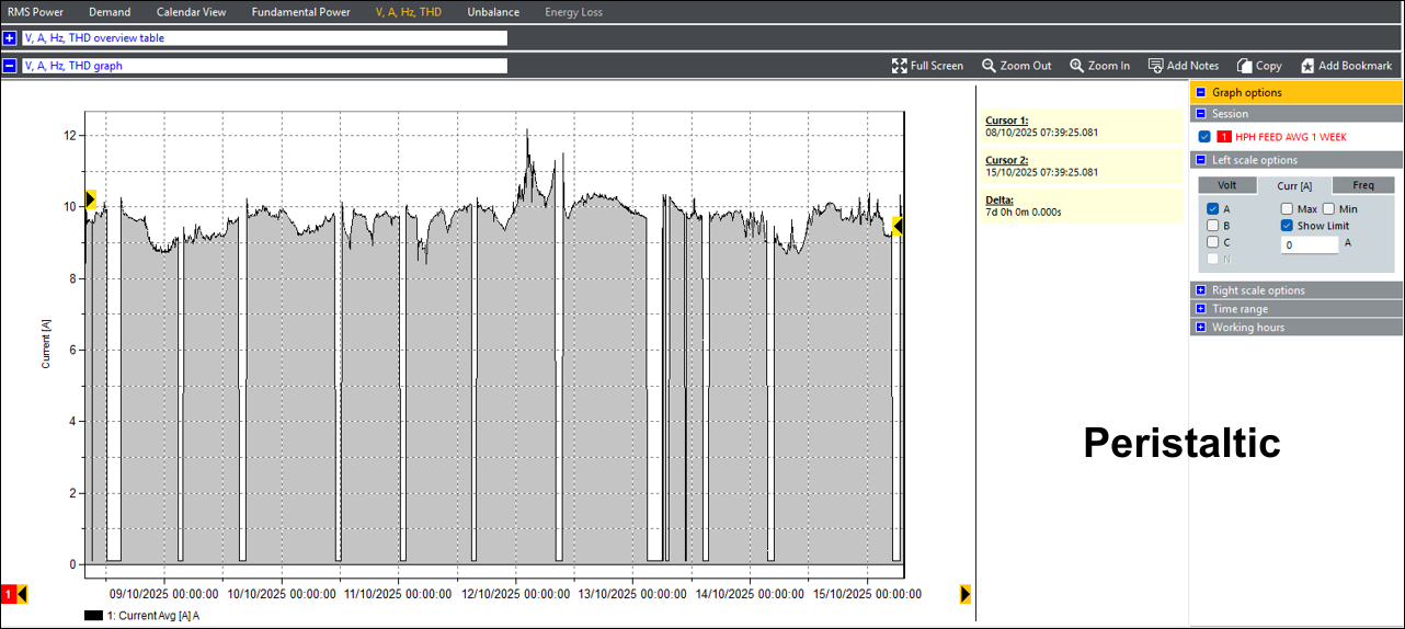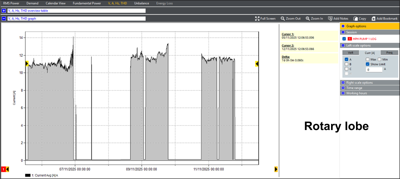 Atlantic Pumps and the water company agreed on a hired trial to put the concept to the test. The client monitored the power consumption of both the lobe pump and the peristatic over 7 days each, using a data logger and software from Fluke.